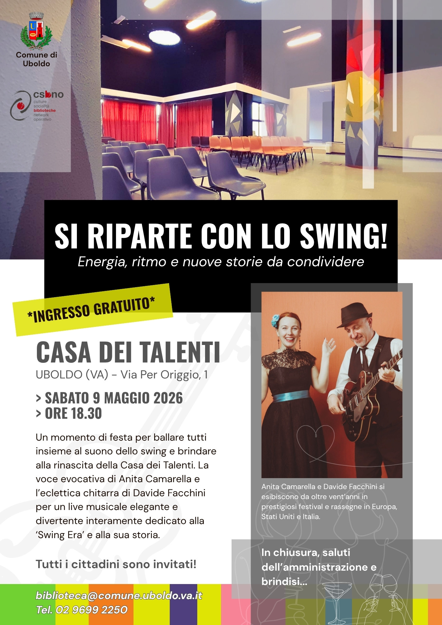 Un momento di festa per ballare tutti insieme al suono dello swing e brindare alla rinascita della Casa dei Talenti. La voce evocativa di Anita Camarella e l’eclettica chitarra di Davide Facchini per un live musicale elegante e divertente interamente dedicato allo ‘Swing Era’ e alla sua storia.
